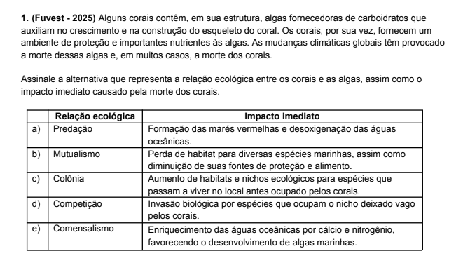 ambas as espécies que interagem obtêm benefícios. As mudanças climáticas globais causam a morte de corais, que servem de abrigo, proteção e alimento para outras espécies, portanto, a sua morte leva a diversos impactos para outras espécies. - (Ufpr – 2025) [C]