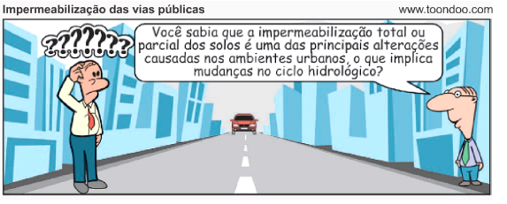 (Enem PPL – 2024) Nas últimas décadas, a população dos centros urbanos tem requerido a pavimentação das vias públicas, visando o aumento do conforto e a minimização do desgaste de veículos. No entanto, essa melhoria da qualidade de vida pode trazer implicações ao meio ambiente. A impermeabilização impede a infiltração de água no solo, sendo carreados, portanto, todos os dejetos e impurezas para os cursos de água.
