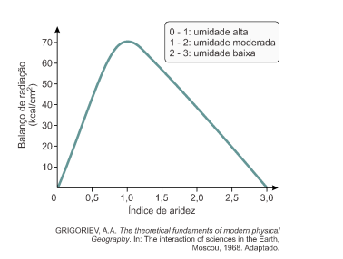 O gráfico revela que no índice de aridez 1, ambientes ecológicos onde o balanço de radiação é igual a 70 kcal/cm² a curva de biomassa e biodiversidade atingem o ápice, correspondentes ao bioma floresta equatorial. Nas savanas e cerrados, biomas intertropicais, o índice de aridez é diferente de 1, porém são formados por ecossistemas climáticos, onde não se verifica aumento significativo da biomassa e da biodiversidade. Nos desertos, o índice de aridez se aproxima de 3, enquanto o índice de radiação é elevado, com baixa biomassa e biodiversidade. Ambientes com neves eternas são caracterizados como desertos frios. - (Uea – 2024) [E]