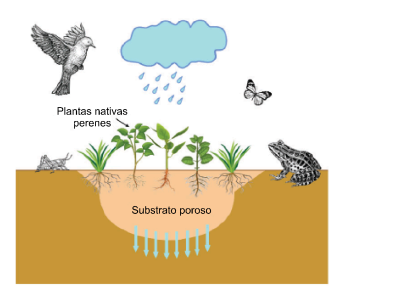 (Fuvest – 2024) Os jardins de chuva, como o esquematizado na figura, vêm sendo implantados em áreas urbanas como uma alternativa de baixo custo para minimizar alagamentos. São canteiros de plantas que ocupam partes rebaixadas do terreno, com a função de reter parte das águas pluviais e diminuir sua velocidade de escoamento. Para isso, o solo do jardim deve ser preparado a fim de absorver a água e facilitar sua infiltração, direcionando-a ao lençol freático. Outra vantagem desses jardins é a retenção e decomposição de poluentes carreados pelas águas pluviais. Ainda, ao mesclar diversos tipos de plantas, os jardins de chuva atraem animais e aumentam a biodiversidade local.