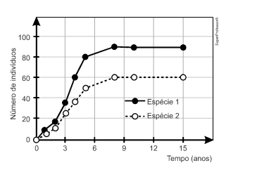 (Unicamp – 2024) A dinâmica populacional de duas espécies que compartilham o mesmo habitat é representada na figura a seguir. O tamanho máximo da população de cada espécie é limitado pela disponibilidade de recursos no habitat.